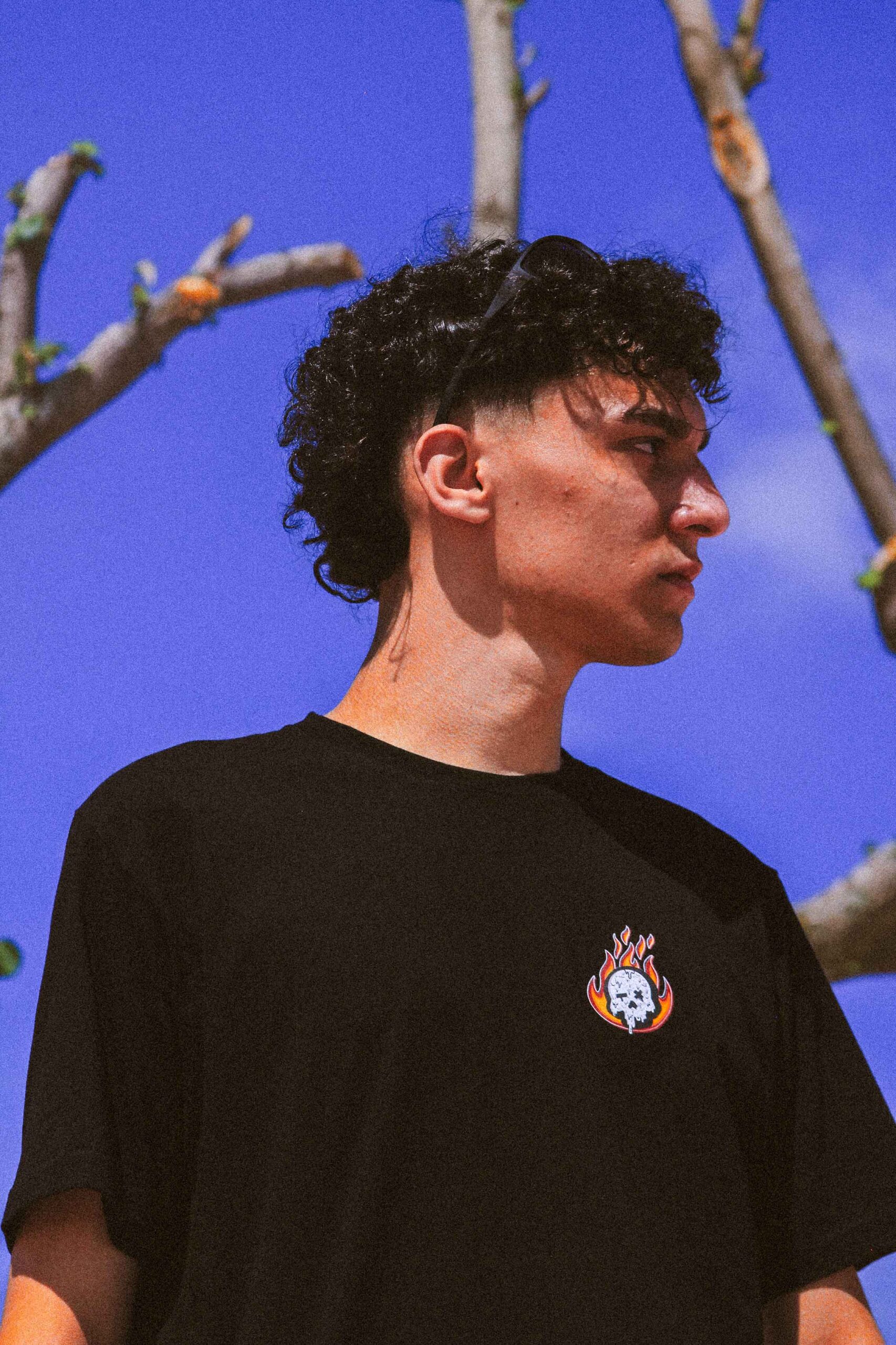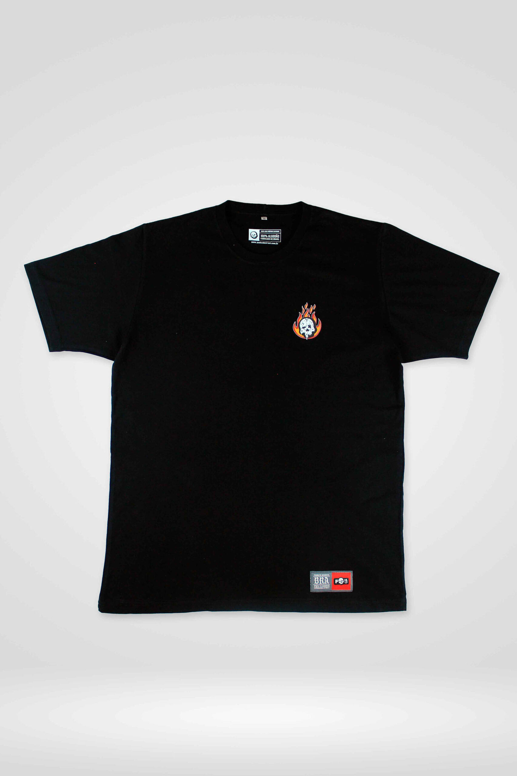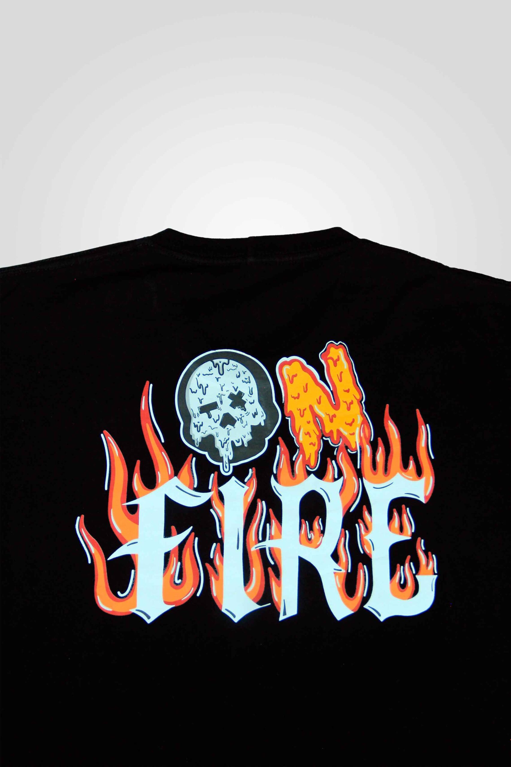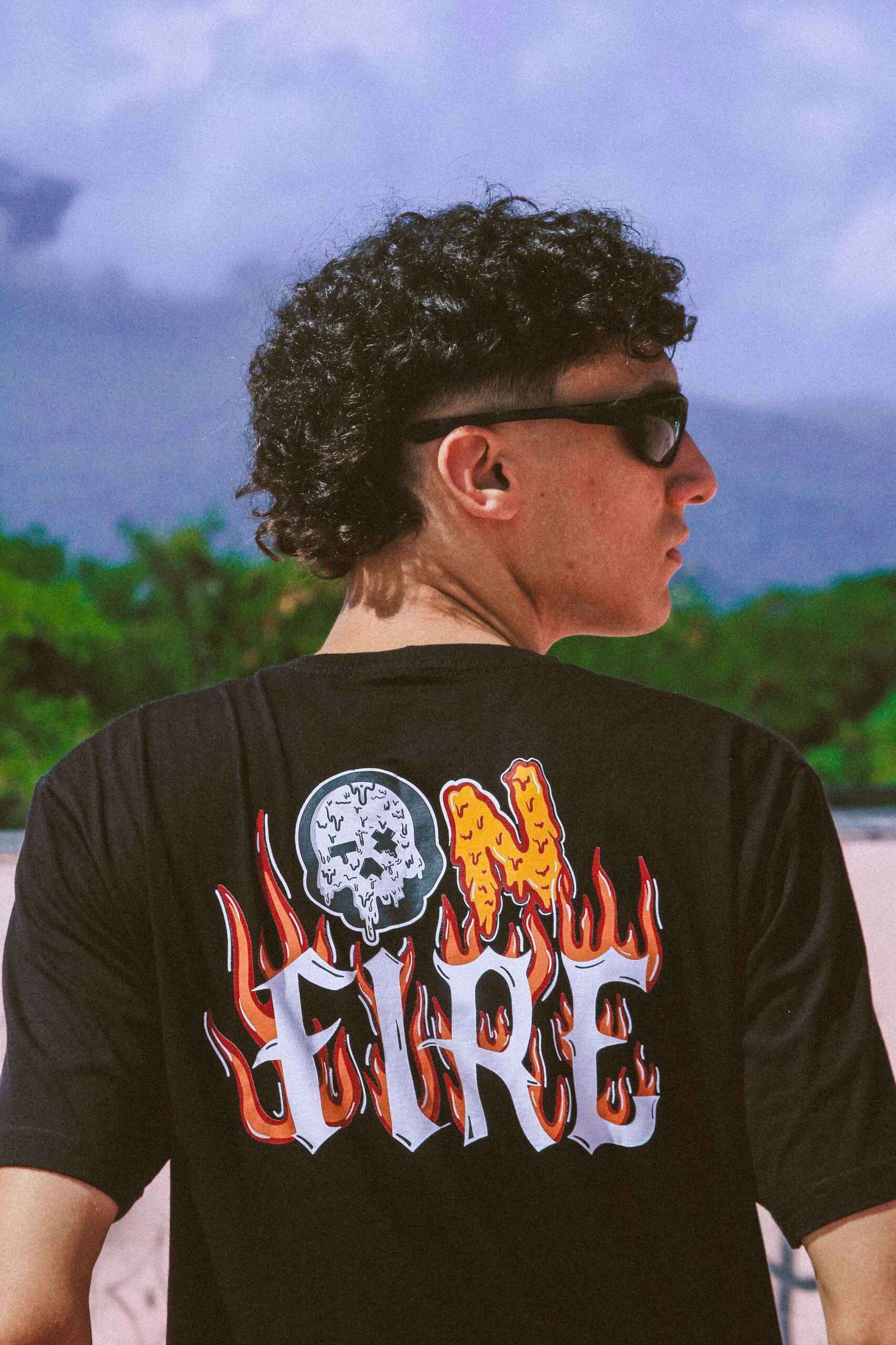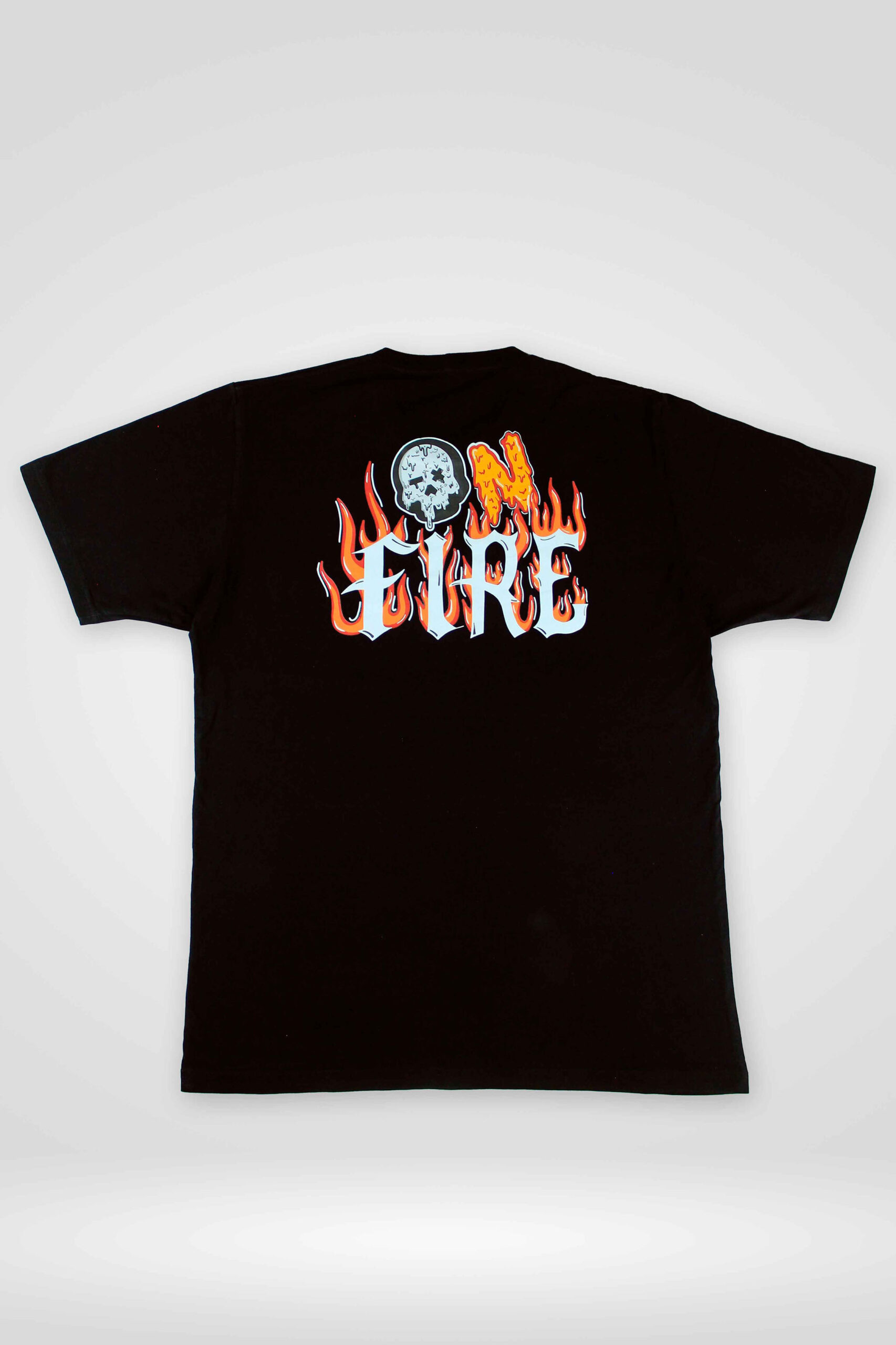 Camiseta “ON FIRE” preta, 100% algodão de alta qualidade, malha 30:1, com acabamento de sobregola e costura reforçada de ombro a ombro.