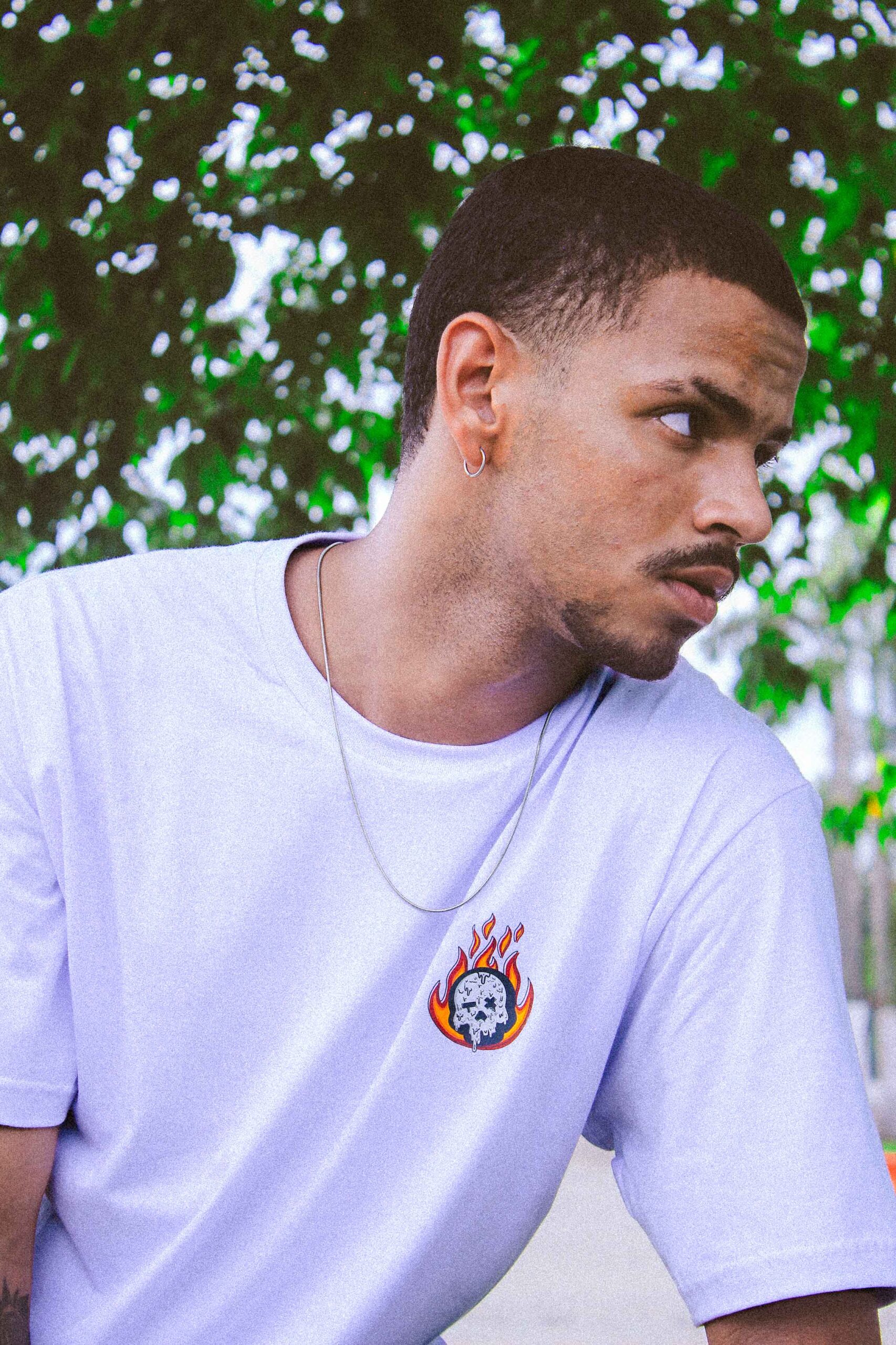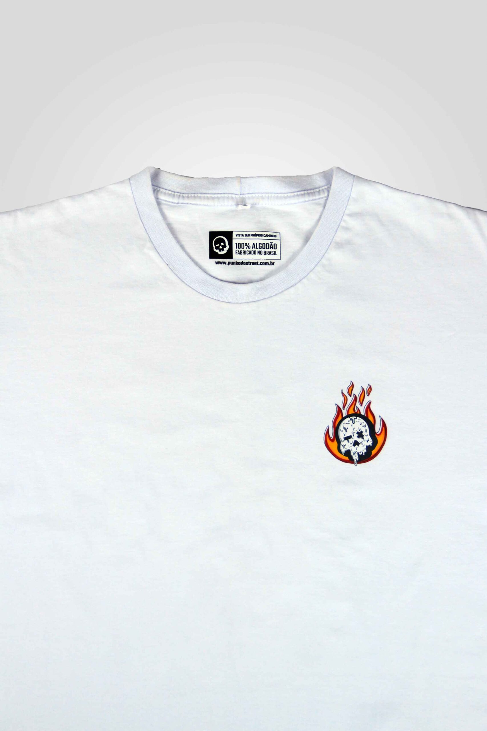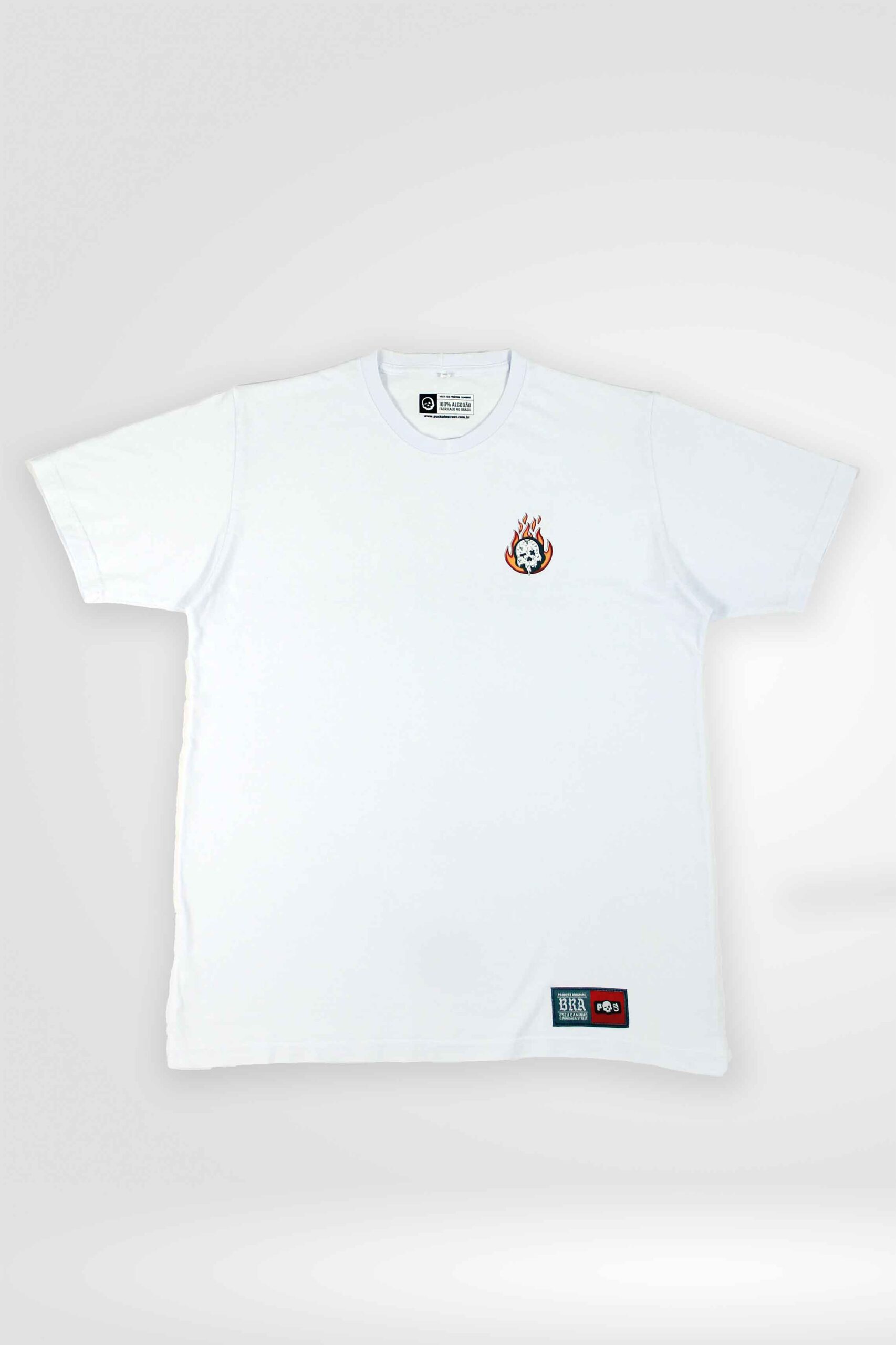 Camiseta “ON FIRE” branca, 100% algodão de alta qualidade, malha 30:1, com acabamento de sobregola e costura reforçada de ombro a ombro.